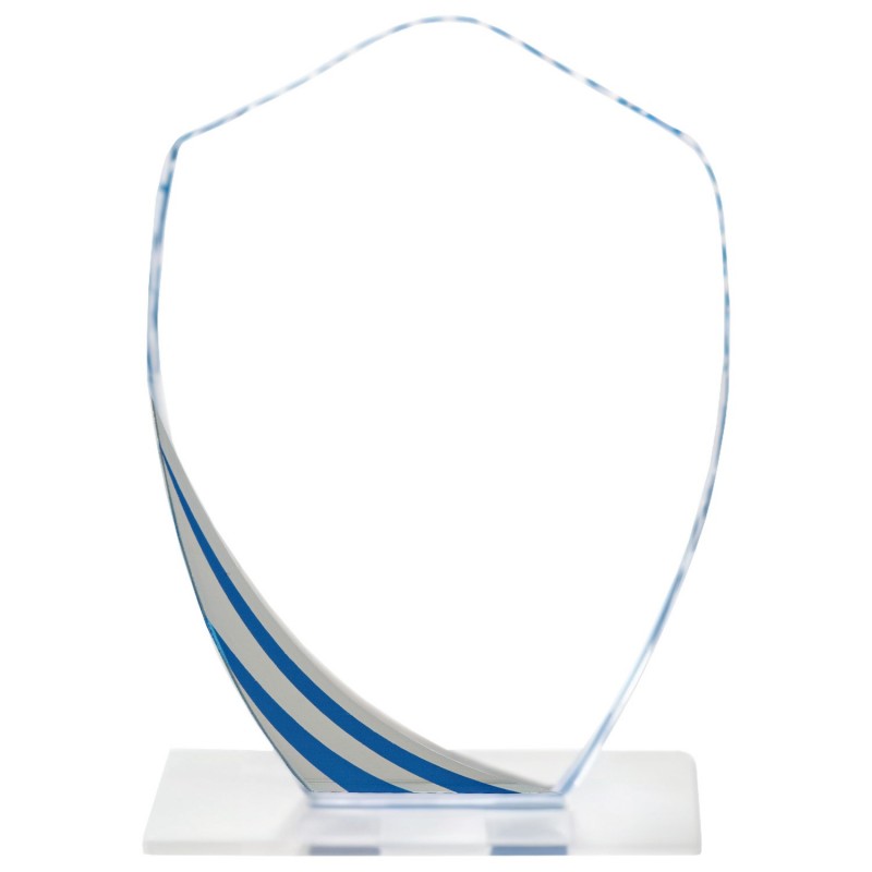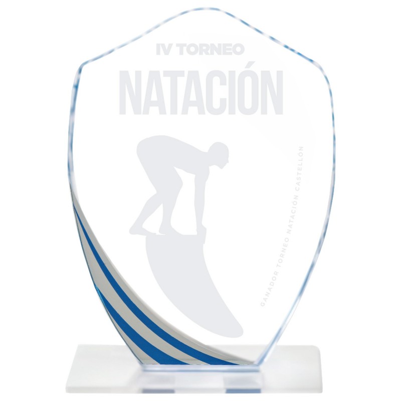 Trofeo de cristal con decoración en color azul de linea moderna y actual. Trofeo ideal para entregar a participantes, campeones y finalistas de competiciones así como para conmemoraciones y dedicatorias. La mejor calidad en trofeos de cristal la encontrarás en maxitrofeo.com.