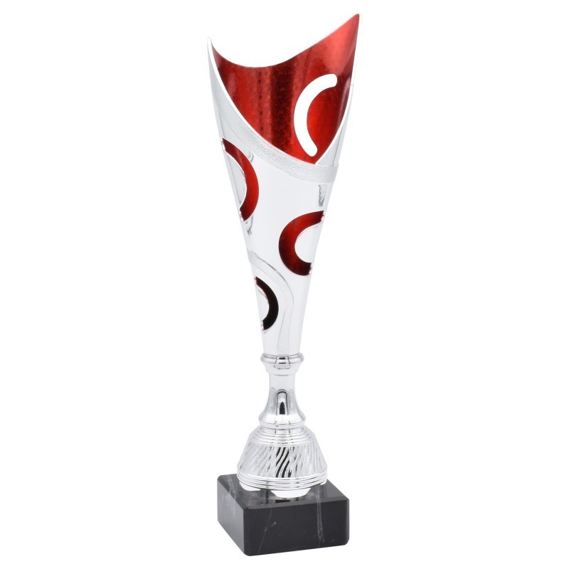 Copa Deportiva 8742: Esta copa deportiva económica es ideal para reconocer el trabajo y esfuerzo de los campeones y finalistas de una competición deportiva. Tiene un diseño moderno de color plateado y rojo, rematada en la base con una peana en mármol. Disponible en 3 grandes tamaños a elegir. Incluye placa con grabación láser personalizada.