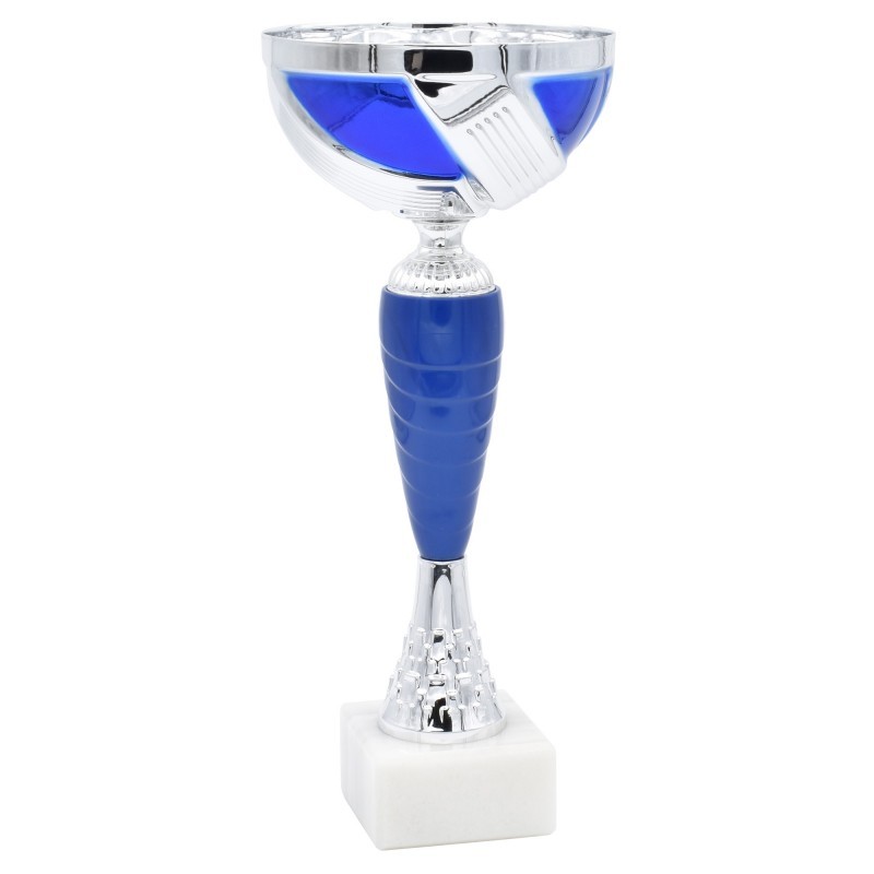 Copa deportiva en color plateado y azul a un precio económico y disponible en 4 tamaños. Su moderno diseño, tamaño y precio la convierten en la opción perfecta para ganadores y participantes de torneos y pruebas deportivas.