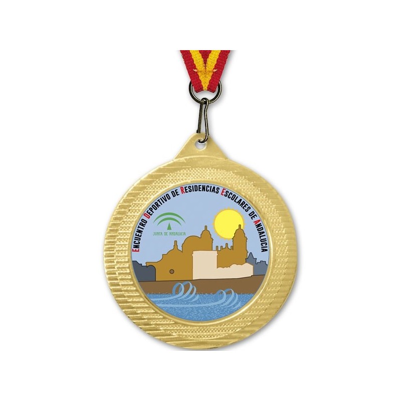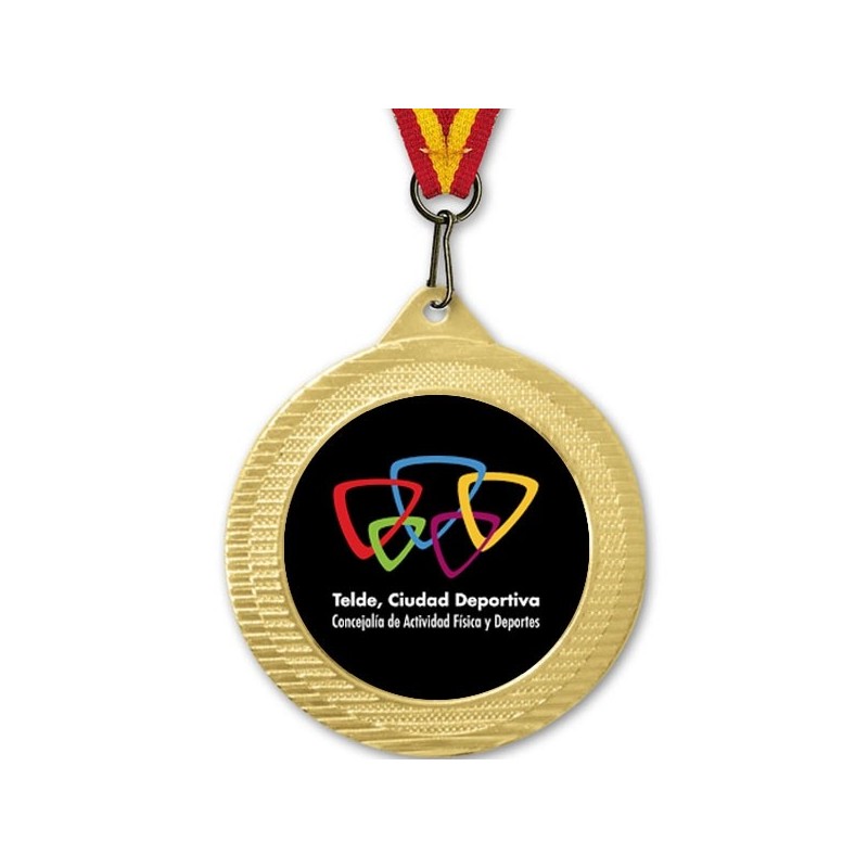 Personaliza la medalla a todo color con el logo y la inscripción que desees. Medalla color dorada de Ø70 mm completa, incluye medalla, centro para personalizar y cinta de 10mm. Medalla deportiva metálica de la categoría Creative Luxe para ganadores y participantes de competiciones deportivas de gran calidad y acabado. Nuestras medallas de la más alta calidad garantizada. (El diseño de la imagen es tan solo un ejemplo ilustrativo)