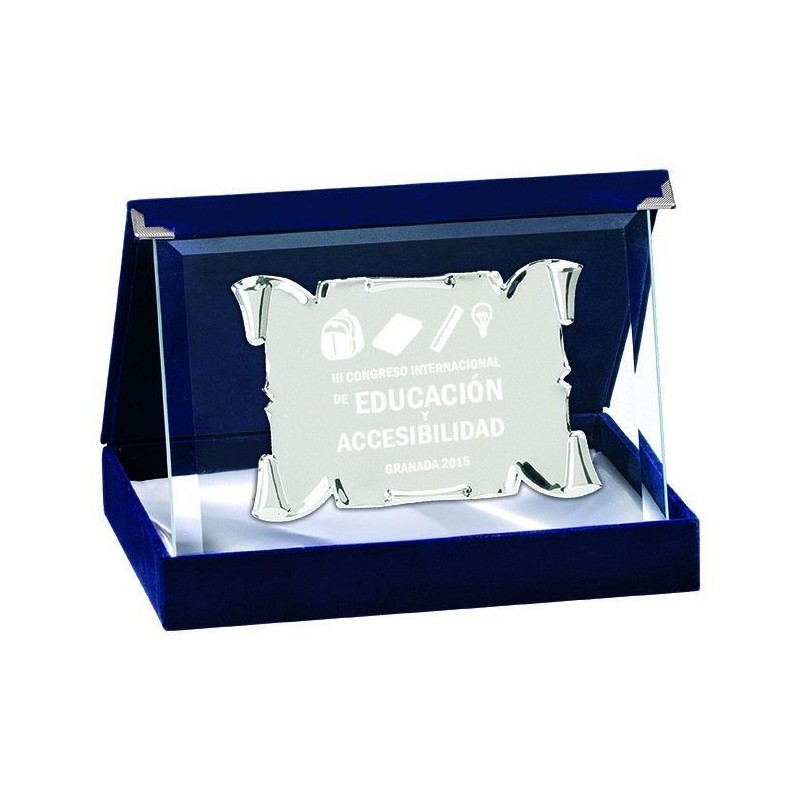 Placa Homenaje 0451: Placa homenaje de la Serie GLASS en color plata con diseño de pergamino, con soporte de cristal. Fabricado en materiales de alta calidad con una linea moderna y actual, disponible en dos medidas. Estuche a juego incluido forrado en terciopelo azul. Grabación laser. Placa ideal para entregar a participantes de eventos, conmemoraciones y homenajes a personalidades. La mejor calidad en placas de homenaje la encontrarás en maxitrofeo.com.