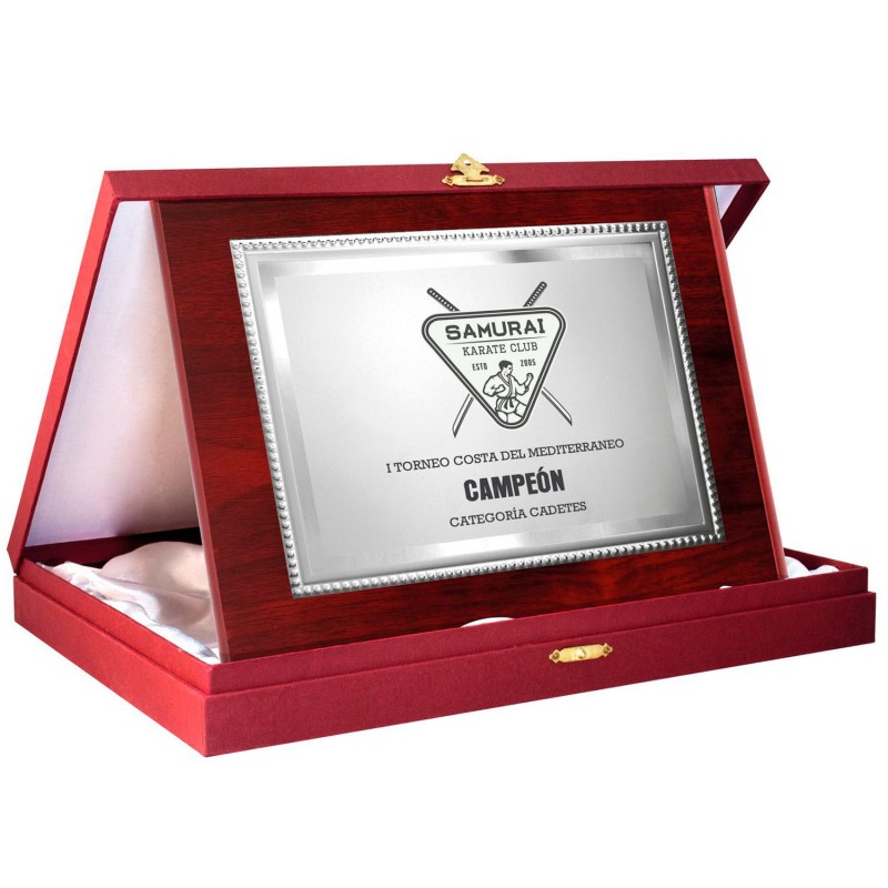Placa homenaje de la Serie PREMIUM en color plata con marco en el mismo color en lineas geométricas. Fabricado en materiales de alta calidad con una linea elegante y moderna, disponible en dos medidas. Con estuche de madera en tono granate, de alta calidad forrado en el interior con fieltro blanco. Grabación láser y color. Placa ideal para entregar a participantes de eventos, conmemoraciones y homenajes a personalidades.