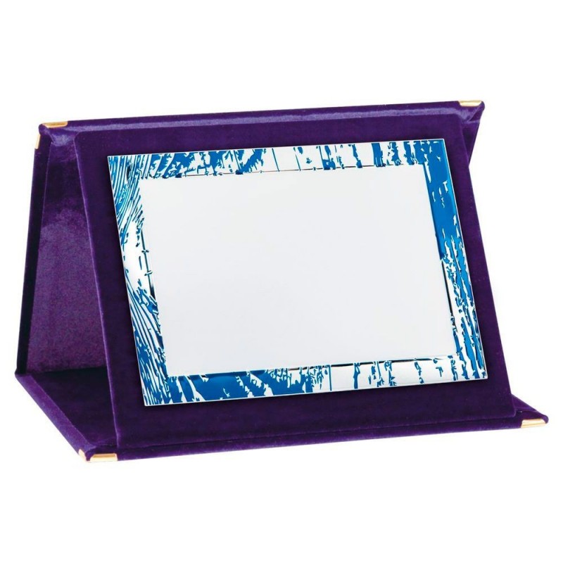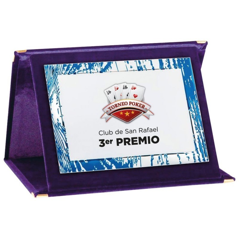 Placa Homenaje 1431: Placa homenaje de la Serie ECO en color plateado con marco ancho decorado en azul, apaisado con soporte forrado en fieltro azul. Fabricado en materiales de alta calidad con una linea moderna y actual, disponible en dos medidas. Estuche a juego incluido forrado en terciopelo azul. Grabación laser o a color. La mejor calidad en placas de homenaje la encontrarás en maxitrofeo.com.
