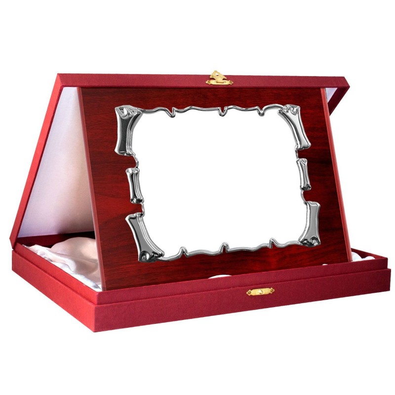 Placa homenaje de la Serie PREMIUM en color blanco y plata con marco en forma de pergamino. Fabricado en materiales de alta calidad con una linea elegante y moderna, disponible en dos medidas. Con estuche de madera en tono granate, de alta calidad forrado en el interior con fieltro blanco. Grabación láser y color. Placa ideal para entregar a participantes de eventos, conmemoraciones y homenajes a personalidades.