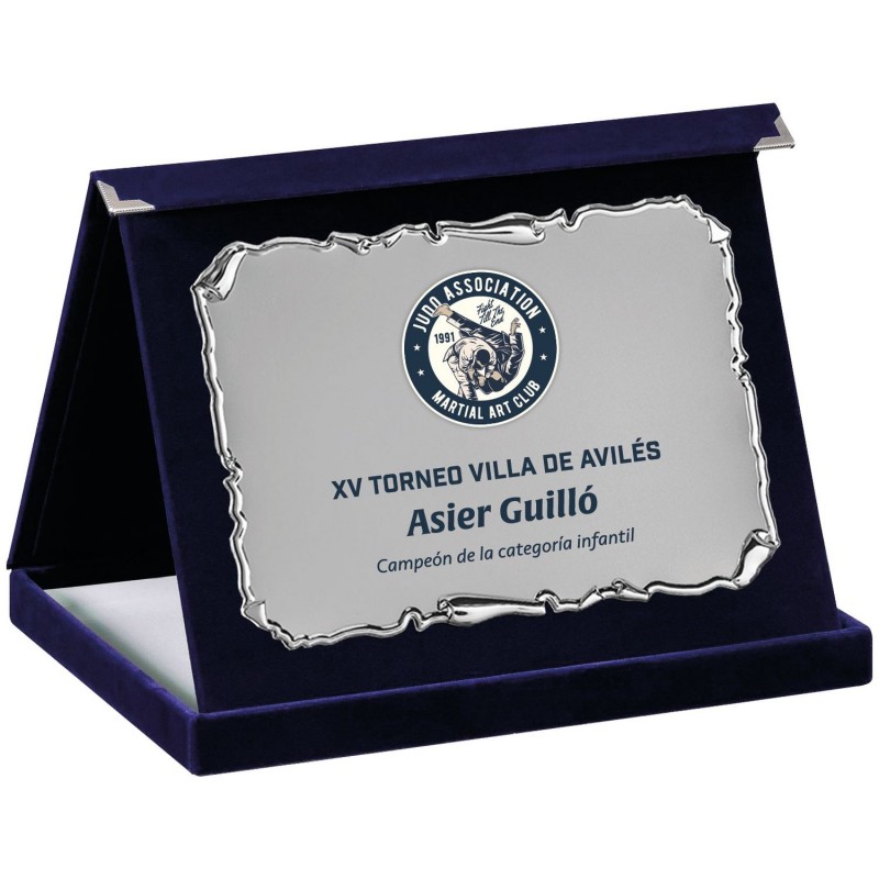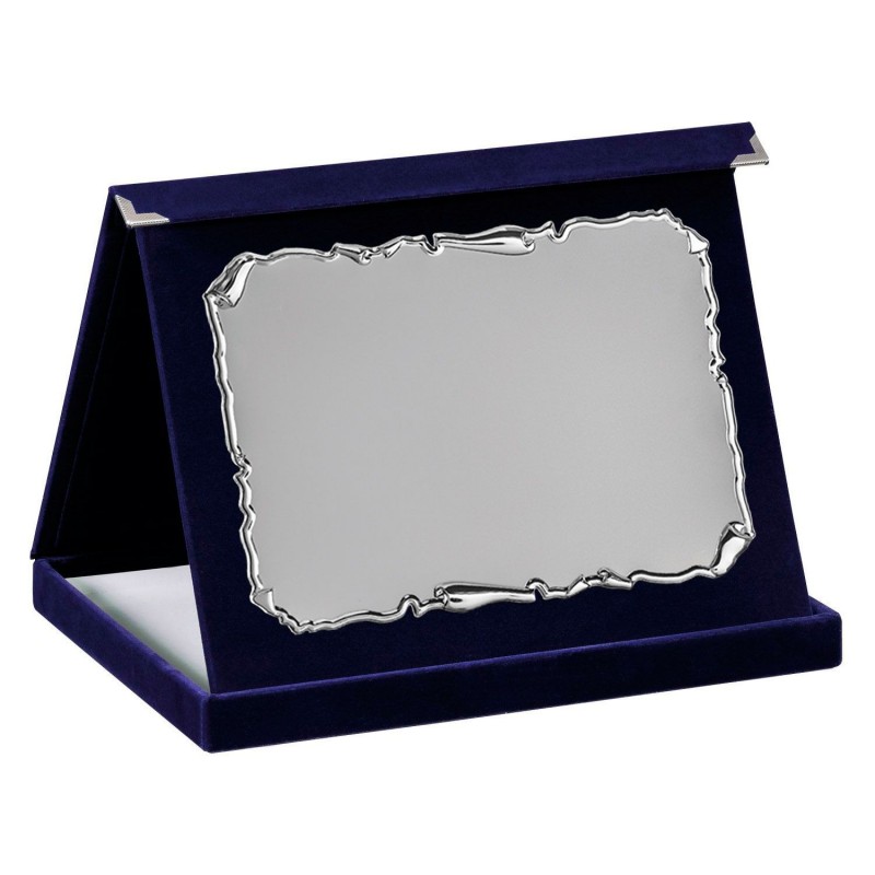 Placa Homenaje 1841: Placa homenaje de la Serie ECO en color plateado con marco decorado estilo pergamino muy moderno y actual, disposición apaisada con elegante soporte forrado en fieltro azul. Fabricado en materiales de alta calidad con una linea moderna y actual, disponible en dos medidas. Estuche a juego incluido forrado en terciopelo azul. Grabación láser o a color. Placa ideal para entregar a participantes de eventos, conmemoraciones y homenajes a personalidades. La mejor calidad en placas de homenaje la encontrarás en maxitrofeo.com.