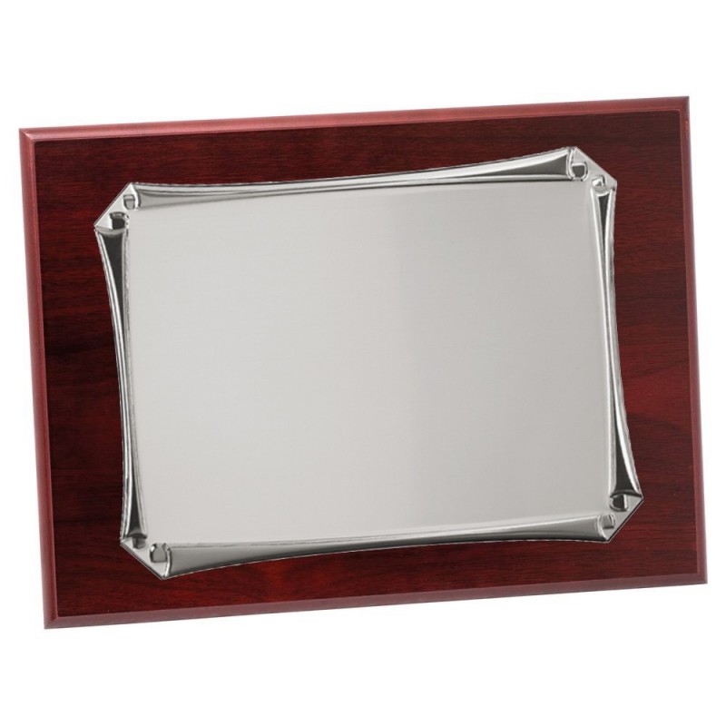 Placa conmemorativa de la Serie PRIZE en color plateado con un elegante acabado con diseño de pergamino. Apaisada con base soporte de madera. Fabricada con materiales de gran calidad con una linea tradicional, disponible en tres medidas. Estuche opcional. Grabación láser. Placa conmemorativa ideal para entregar a participantes de eventos, conmemoraciones y homenajes a personalidades.