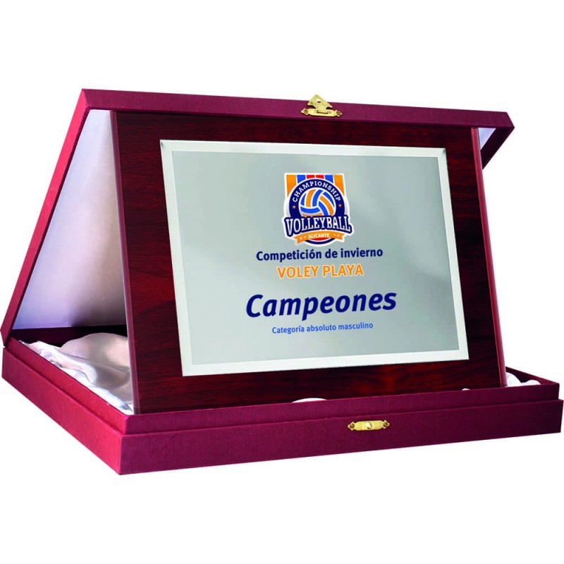 Placa Homenaje 1861: Placa homenaje de la Serie Premium en color plateado con marco decorado estilo mosaico, muy moderno y actual. Disposición apaisada con elegante soporte, con estuche de madera de alta calidad forrado en el interior con fieltro blanco. Grabación láser y a color. Disponible en dos medidas. Placa ideal para entregar a participantes de eventos, conmemoraciones y homenajes a personalidades. La mejor calidad en placas de homenaje la encontrarás en maxitrofeo.com.