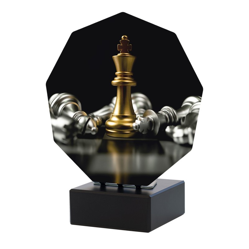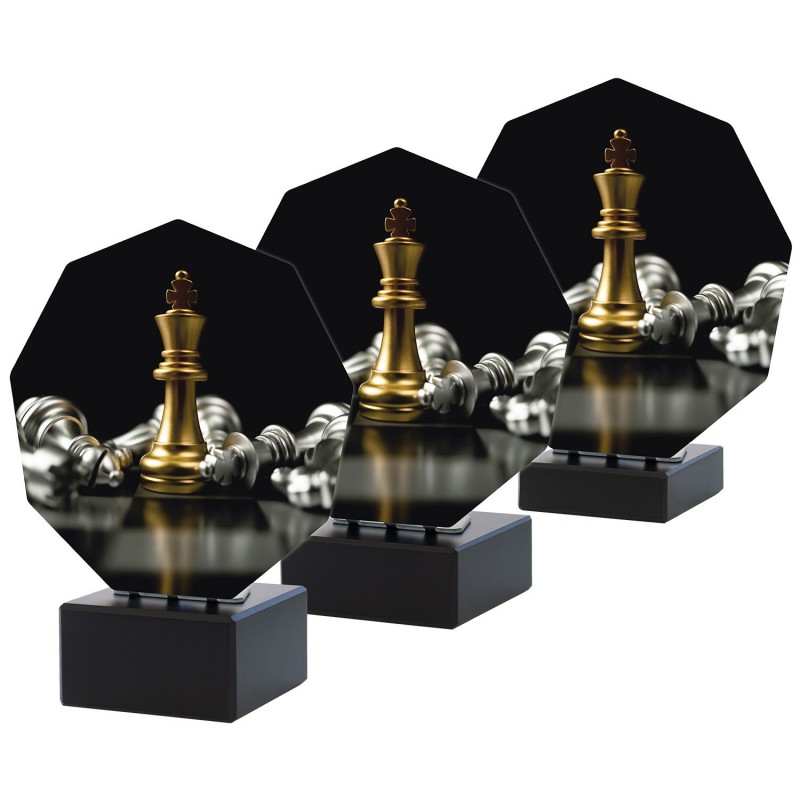 Trofeo moderno para torneos de ajedrez. Colección Luxor con base de mármol, disponible en tres tamaños. Personalización incluida.