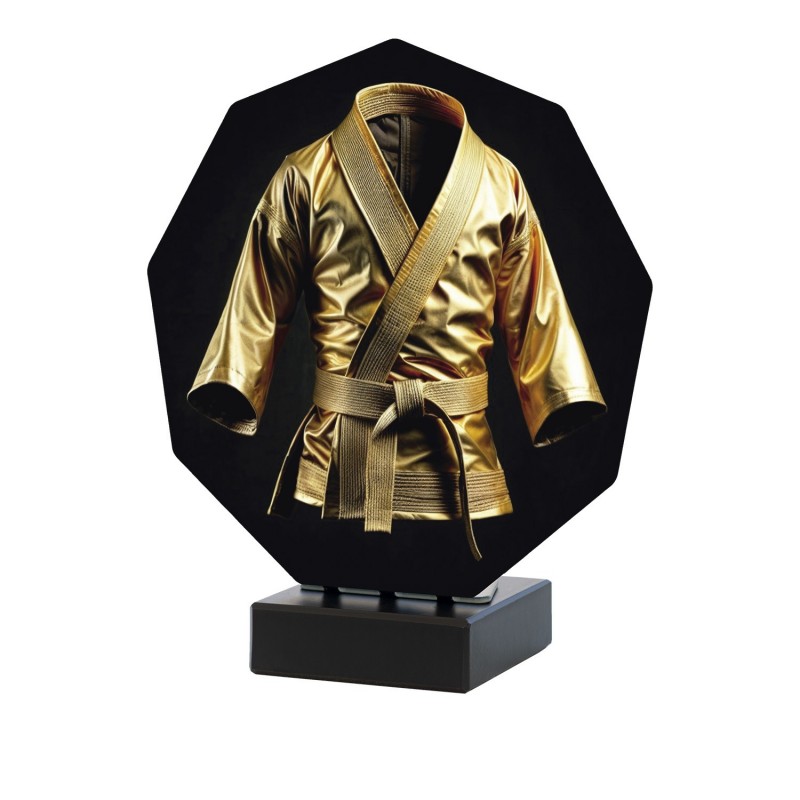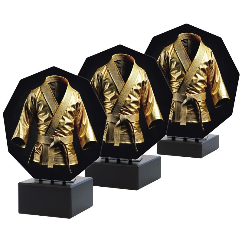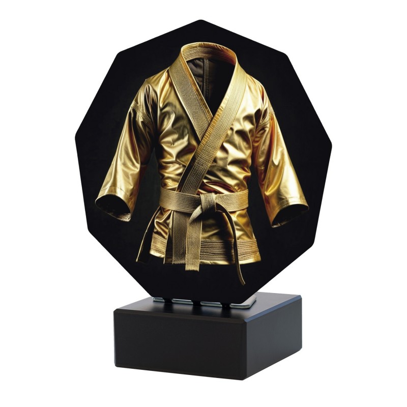 Disponible en tres medidas y montado sobre una base de mármol, este trofeo destaca por su elegancia y firmeza. Además, puedes personalizarlo con el nombre del torneo, logotipos, cintos o categorías, creando así un recuerdo único para cada atleta.
