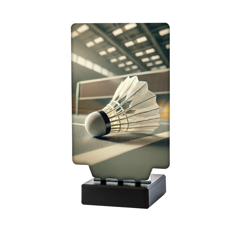 Trofeo metálico para premiar a los campeones de bádminton, con base de mármol. Disponible en tres tamaños y personalizable.