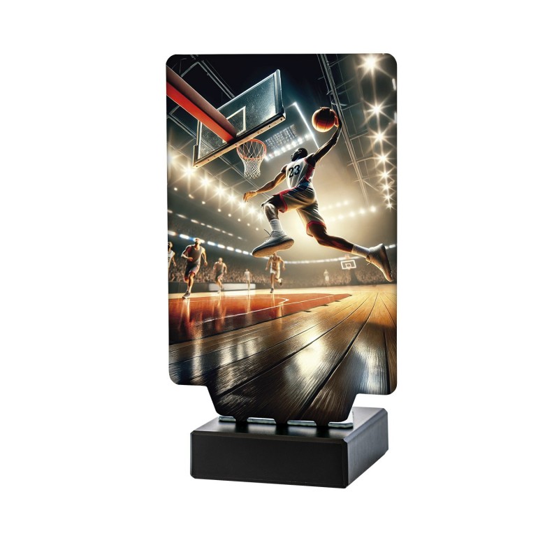 Trofeo metálico para premiar a los campeones de baloncesto, con base de mármol. Disponible en tres tamaños y personalizable.