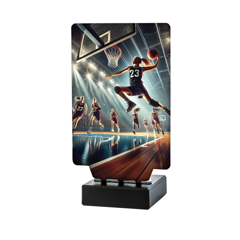 Trofeo metálico para premiar a la campeona femenina de baloncesto, con base de mármol. Disponible en tres tamaños y personalizable.