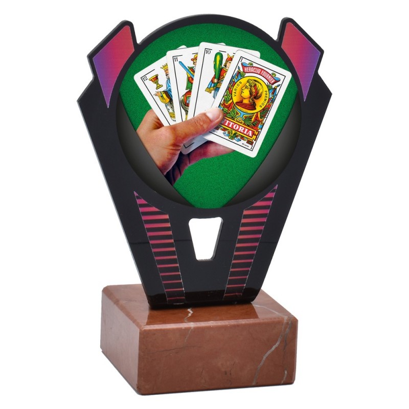 Trofeo deportivo de metacrilato de la serie 0021 con disco central de 4 cartas. Fabricado en metacrilato con una línea moderna y actual, de gran calidad y con base de mármol. Trofeo ideal para entregar a participantes, campeones y finalistas de competiciones y torneos de mus .