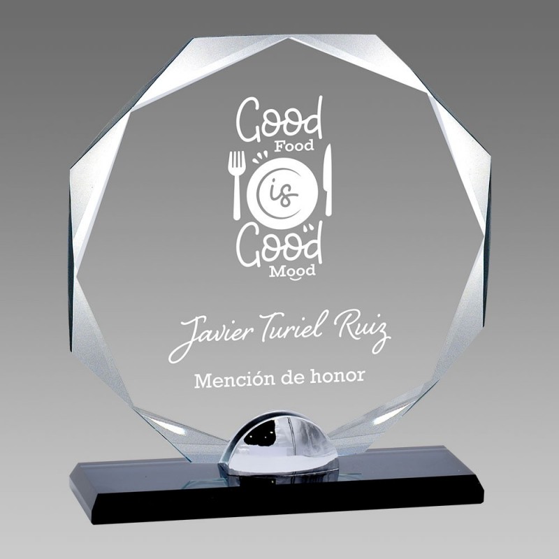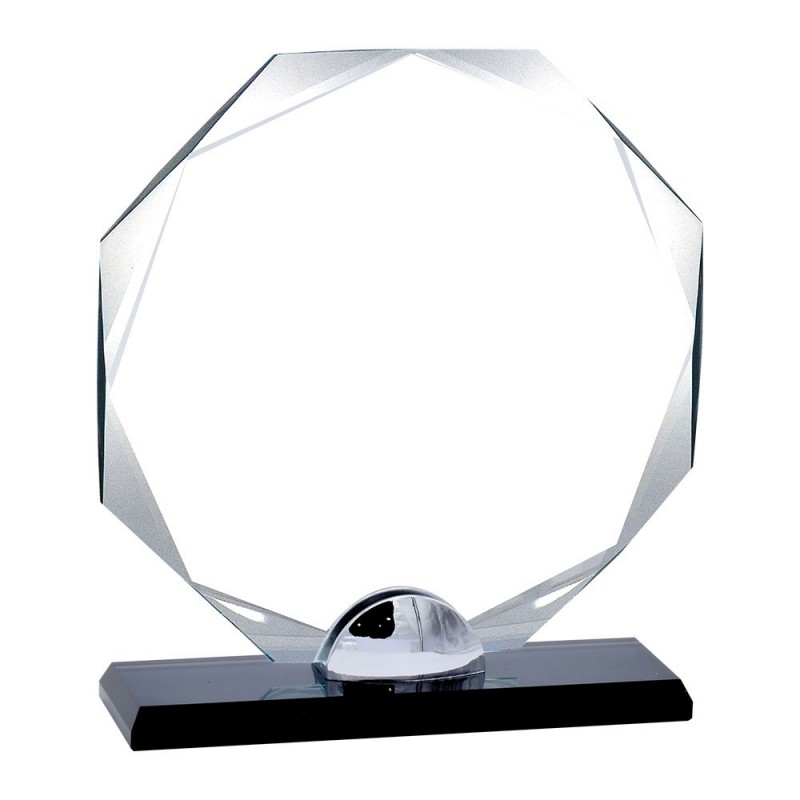 Elige este trofeo de cristal y sorprende entregando un obsequio de calidad y con un gran diseño. Cuenta con varias medidas y tiene un diseño de forma octogonal y cantos biselados con una base en color negro. Trofeo ideal para entregar a participantes, campeones y finalistas de competiciones así como para conmemoraciones y dedicatorias.