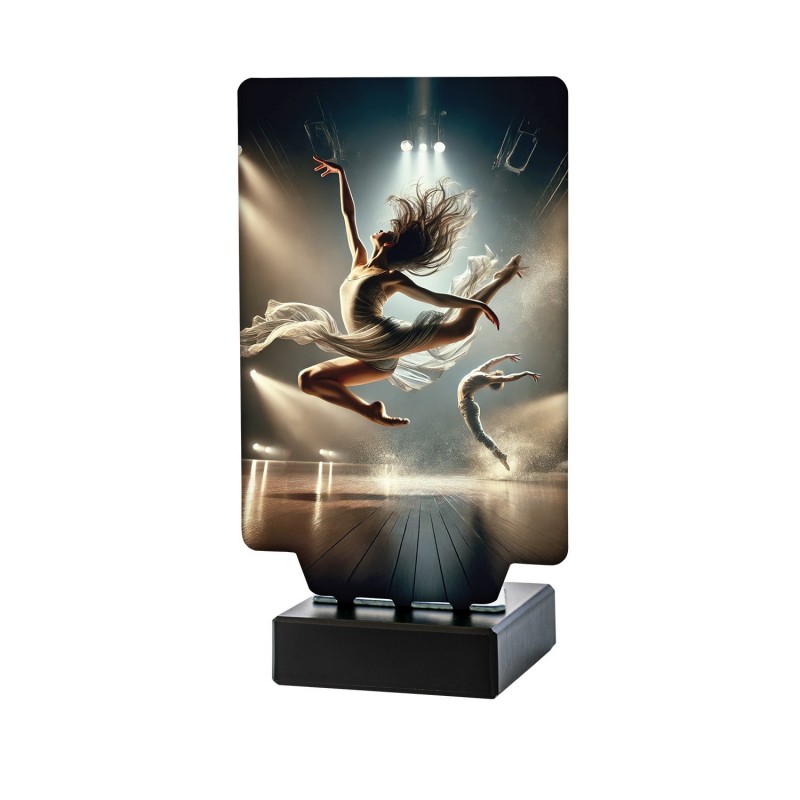 Con un diseño dinámico y elegante, este trofeo captura la esencia de la danza moderna, reflejando la libertad de movimiento y la expresión artística. La base de mármol le otorga un toque de distinción, asegurando que cada premiación sea tan única como el estilo de baile que se celebra.