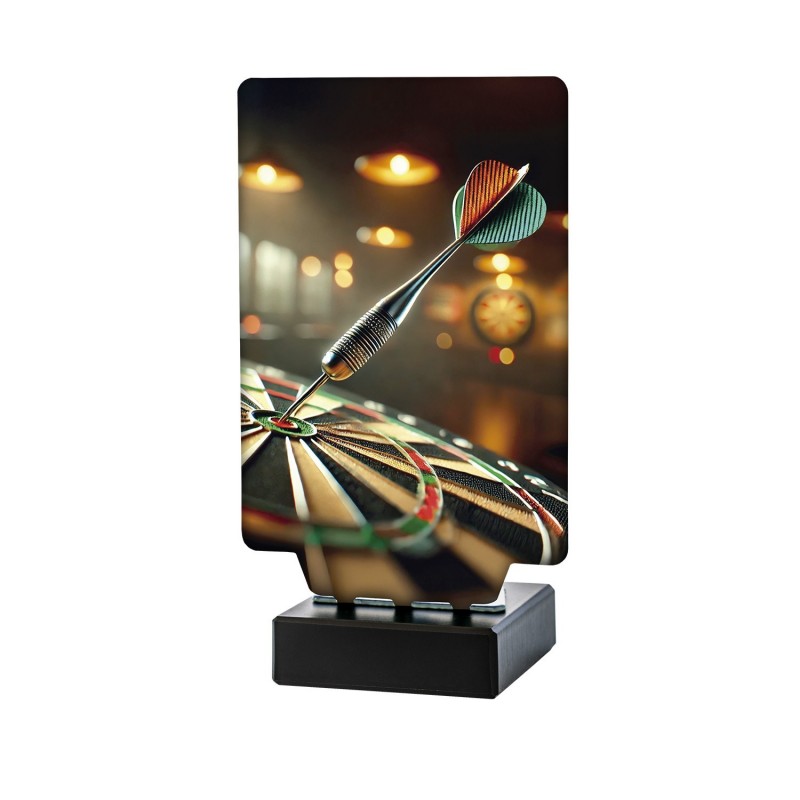 Trofeo metálico para premiar a los campeones de dardos, con base de mármol. Disponible en tres tamaños y personalizable.