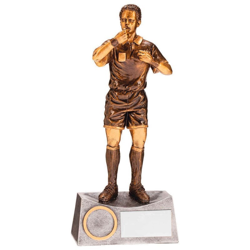Trofeo de árbitro perfecto para reconocer la labor de los árbitros durante un torneo o para conmemorar su trayectoría en los terrenos de juego. Realizado en resina de gran resistencia y posibilidad de grabado.