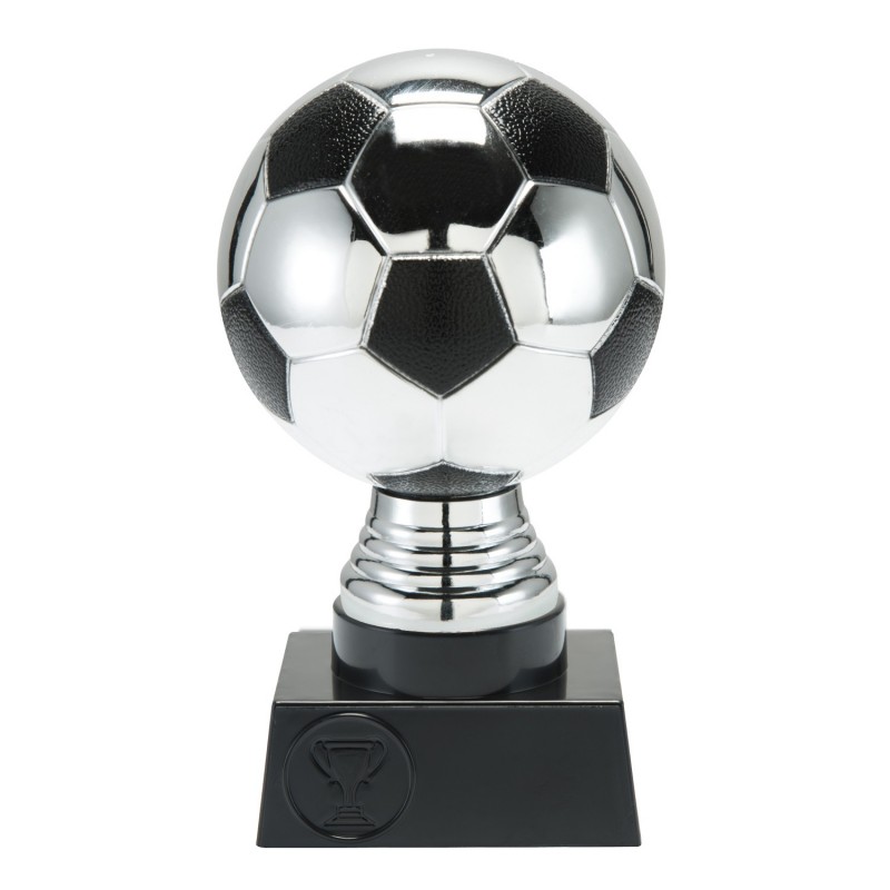 Trofeo de Fútbol que forma parte de la colección de trofeos deportivos Fast ICO con acabados en color plateado y disponibles en tres alturas. Por sus características son perfectos como trofeos de participación en competiciones de fútbol y fútbol sala. Fabricado completamente en PVC de alta calidad con acabado plata y negro. La peana acabada en color negro, lo que permite que el trofeo sea el centro de atención. En este trofeo destaca la figura de un balón de fútbol. Opcional la grabación de texto a láser en placa colocada en la peana.