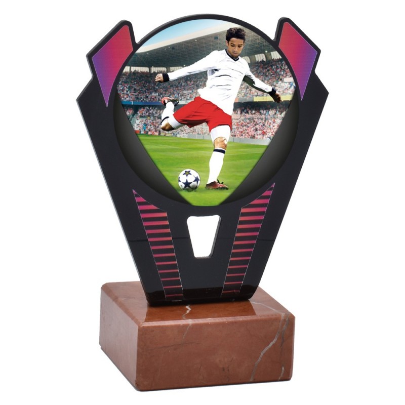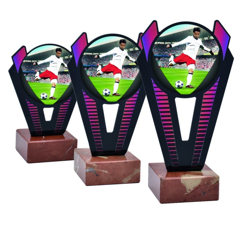 Trofeo deportivo de metacrilato de la serie 0021 con disco central de fútbol masculino incluido. Fabricado en metacrilato con una línea moderna y actual, de gran calidad y con base de mármol. Trofeo ideal para entregar a participantes, campeones y finalistas de competiciones y torneos de fútbol masculino.