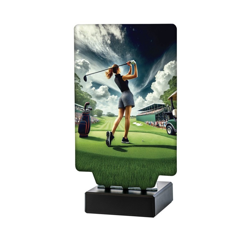 Trofeo metálico para premiar a la campeona femenina de golf, con base de mármol. Disponible en tres tamaños y personalizable.