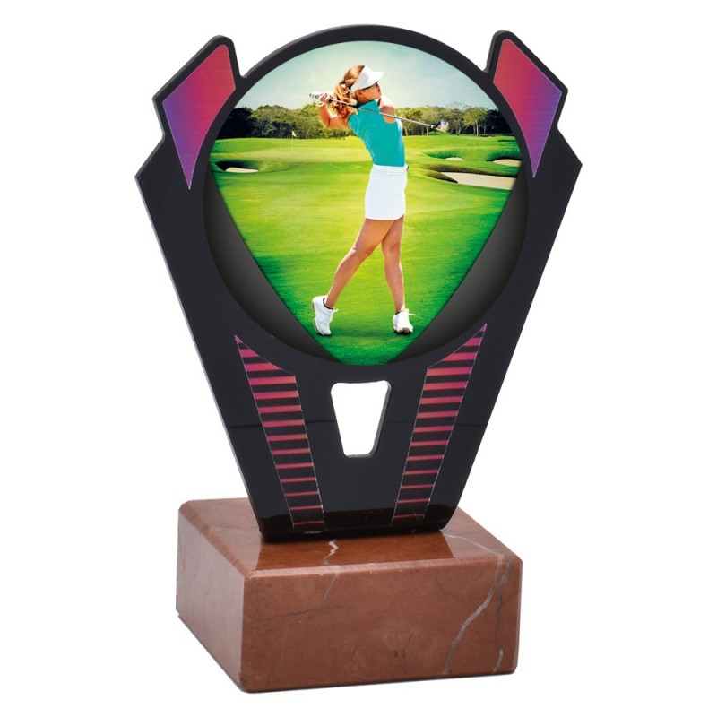 Trofeo deportivo de metacrilato de la serie 0021 con disco central de golf. Fabricado en metacrilato con una línea moderna y actual, de gran calidad y con base de mármol. Trofeo ideal para entregar a participantes, campeonas y finalistas de competiciones y torneos de golf femenino.