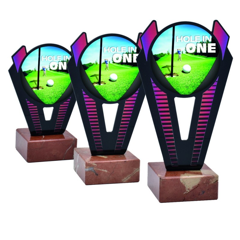 Trofeo deportivo de golf realizado en metacrilato de la serie 0021. Fabricado en metacrilato con una línea moderna y actual, de gran calidad y con base de mármol. Trofeo ideal para entregar a participantes, campeonas y finalistas de competiciones y torneos de golf que realicen hoyo en 1.