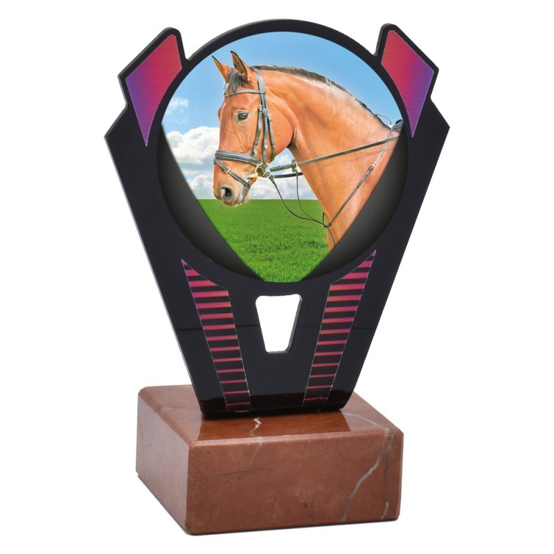 Trofeo deportivo de metacrilato de la serie 0021 con disco central de un caballo. Fabricado en metacrilato con una línea moderna y actual, de gran calidad y con base de mármol. Trofeo ideal para entregar a participantes, campeones y finalistas de competiciones y torneos de hípica general, salto o doma.