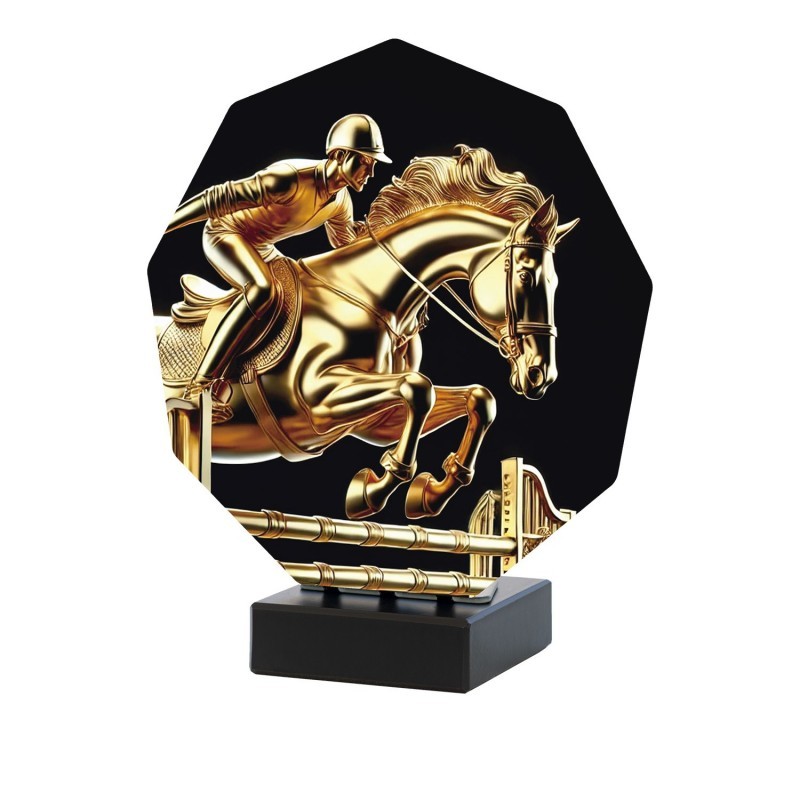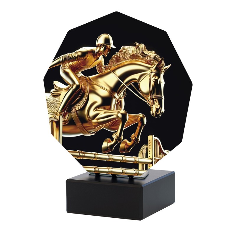 Disponible en tres tamaños, este trofeo se asienta sobre una sólida base de mármol que aporta estabilidad y distinción, realzando la ceremonia de premiación y haciendo honor al esfuerzo del binomio jinete-caballo.