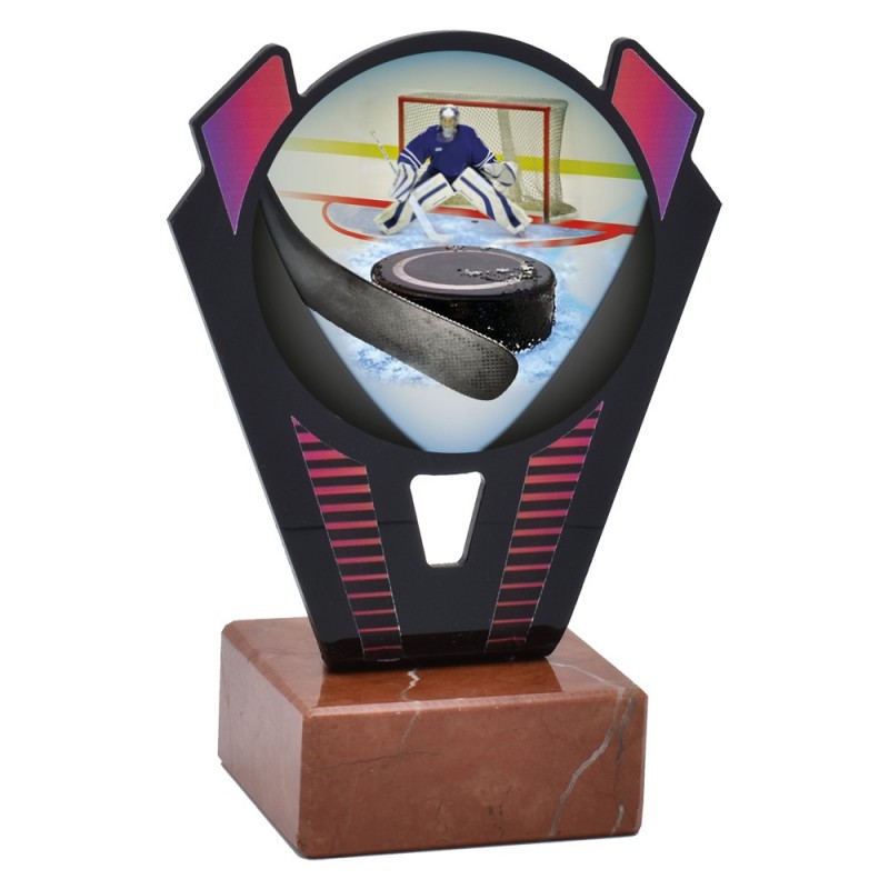 Trofeo deportivo de metacrilato de la serie 0021 con disco central de hockey hielo. Fabricado en metacrilato con una línea moderna y actual, de gran calidad y con base de mármol. Trofeo ideal para entregar a participantes, campeones y finalistas de competiciones y torneos de hockey hielo.
