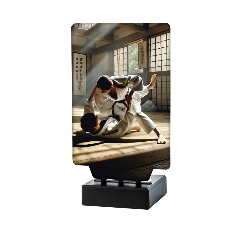 El Trofeo Judo Femenino de la Colección Aura celebra la habilidad, disciplina y fuerza de la campeona femenina en judo. Este trofeo metálico, con una base de mármol, resalta el esfuerzo y la técnica que hacen del judo una de las disciplinas más respetadas.