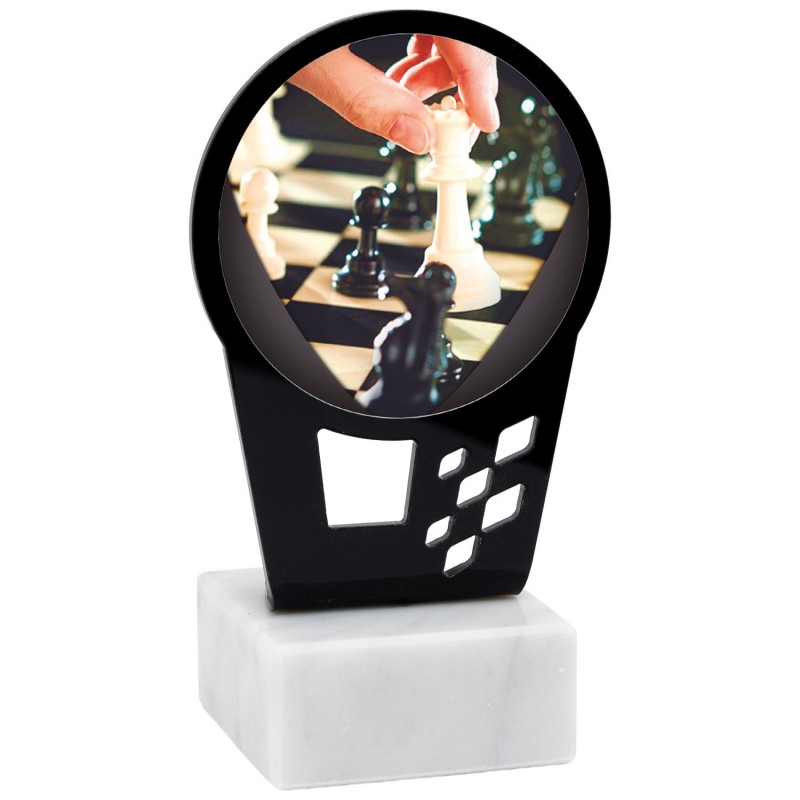 Trofeo deportivo de metacrilato de la serie 0011 con disco central de 80mm de ajedrez incluido. Fabricado en metacrilato con una línea moderna y actual, de gran calidad y con base de mármol. Trofeo ideal para entregar a participantes, campeones y finalistas de competiciones y eventos deportivos.