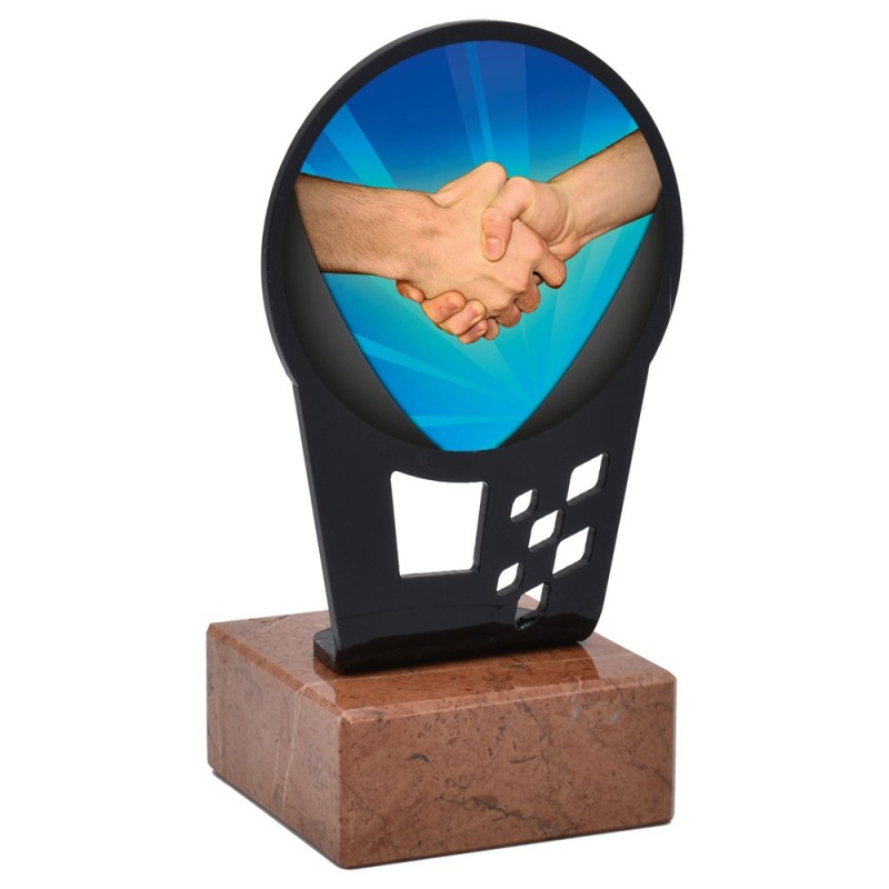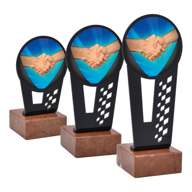 Trofeo deportivo de metacrilato de la serie 0011 con disco central de dos manos entrlazadas, simbolizando la amistad. Fabricado en metacrilato con una línea moderna y actual, de gran calidad y con base de mármol. Trofeo ideal para entregar a participantes, campeones y finalistas de competiciones y torneos deportivos.