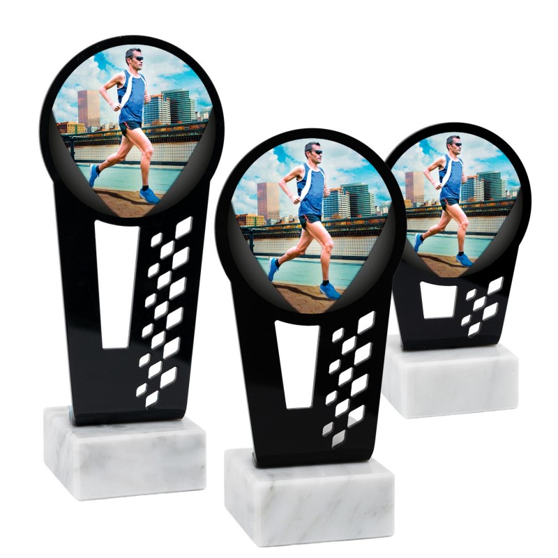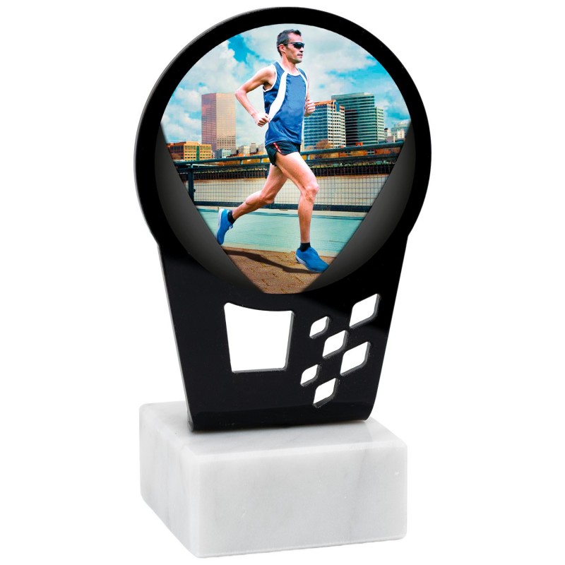 Trofeo deportivo de metacrilato de la serie 0011 con disco central de atletismo masculino, con una atleta corriendo. Fabricado en metacrilato con una línea moderna y actual, de gran calidad y con base de mármol. Trofeo ideal para entregar a participantes, campeones y finalistas de competiciones y torneos de atletismo.