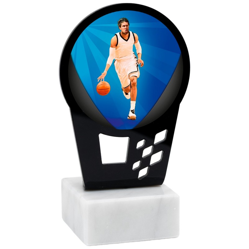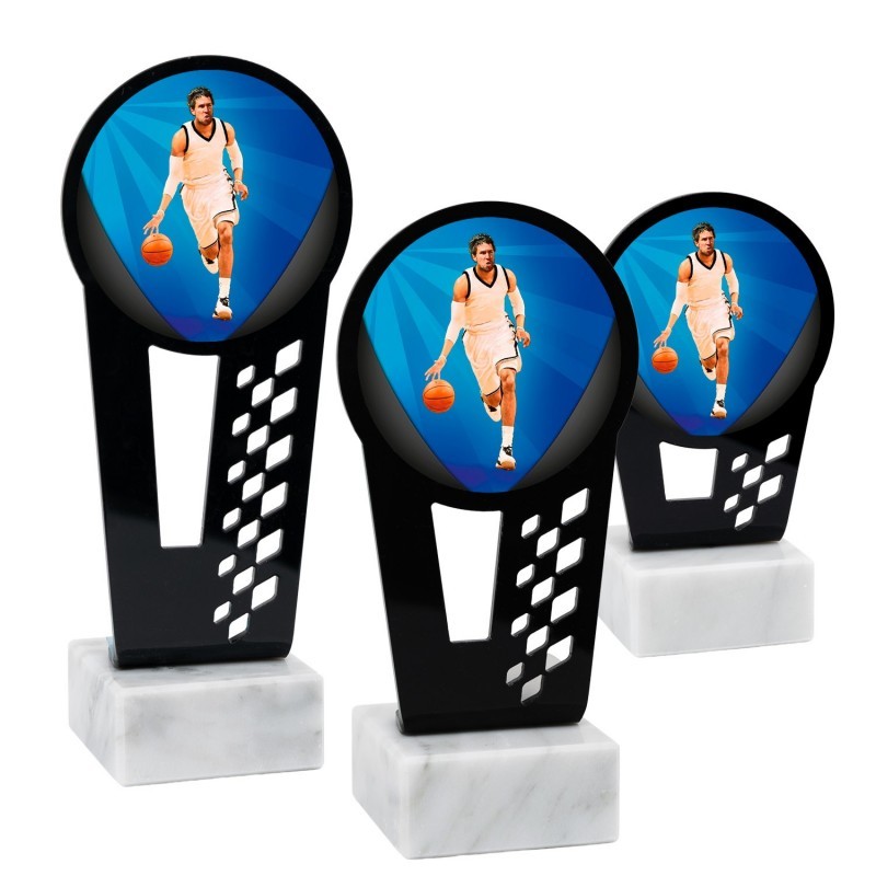 Trofeo deportivo de metacrilato de la serie 0011 con disco central de jugador de baloncesto botando una pelota incluido. Fabricado en metacrilato con una línea moderna y actual, de gran calidad y con base de mármol. Trofeo ideal para entregar a participantes, campeones y finalistas de competiciones y torneos de baloncesto masculino.