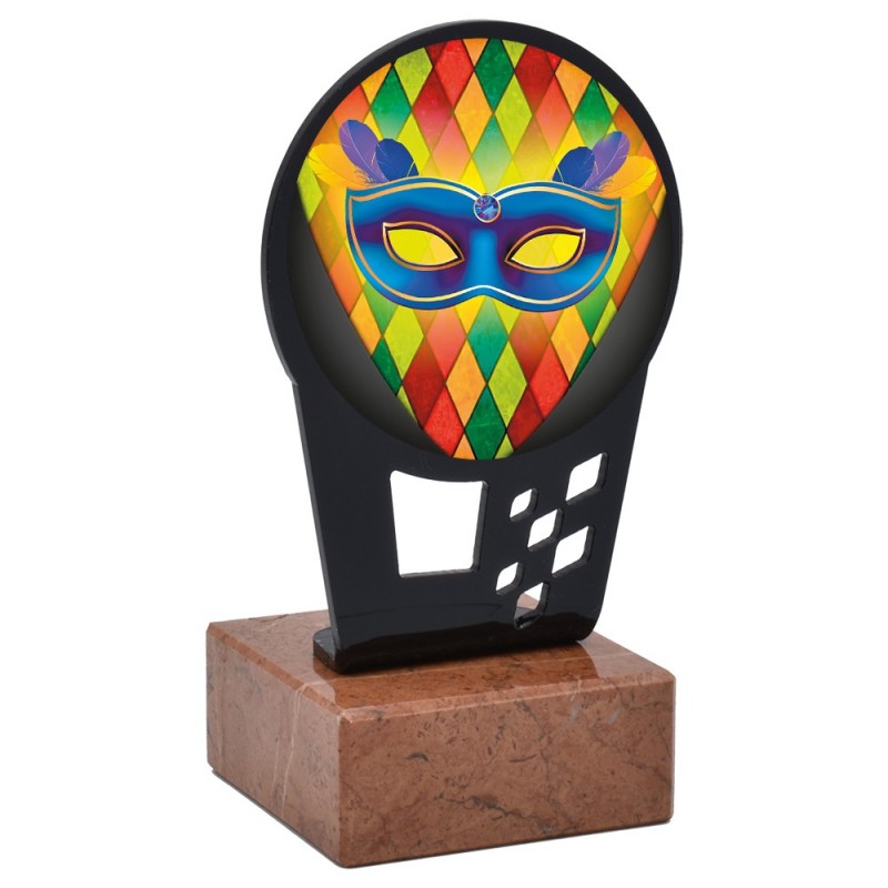 Trofeo deportivo de metacrilato de la serie 0011 con disco central de una máscara de carnaval con fondo arlequinado incluido. Fabricado en metacrilato con una línea moderna y actual, de gran calidad y con base de mármol. Trofeo ideal para entregar a participantes, campeones y finalistas de competiciones y eventos de carnaval.
