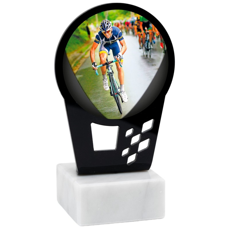 Trofeo deportivo de metacrilato de la serie 0011 con disco central de un ciclista sobre la bicicleta, con un grupo perseguidor detrás incluido. Fabricado en metacrilato con una línea moderna y actual, de gran calidad y con base de mármol. Trofeo ideal para entregar a participantes, campeones y finalistas de competiciones y torneos de ciclismo.