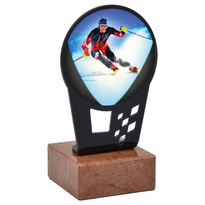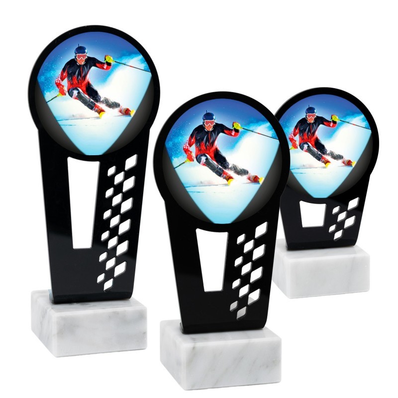 Trofeo deportivo de metacrilato de la serie 0011 con disco central de esquí incluido. Fabricado en metacrilato con una línea moderna y actual, de gran calidad y con base de mármol. Trofeo ideal para entregar a participantes, campeones y finalistas de competiciones y torneos de esquí.