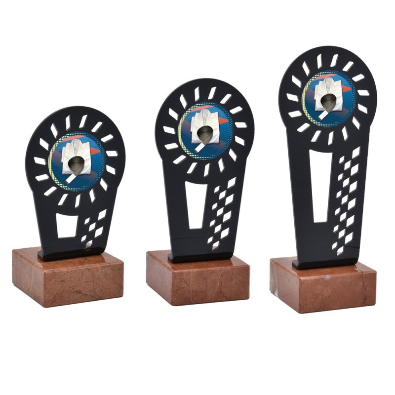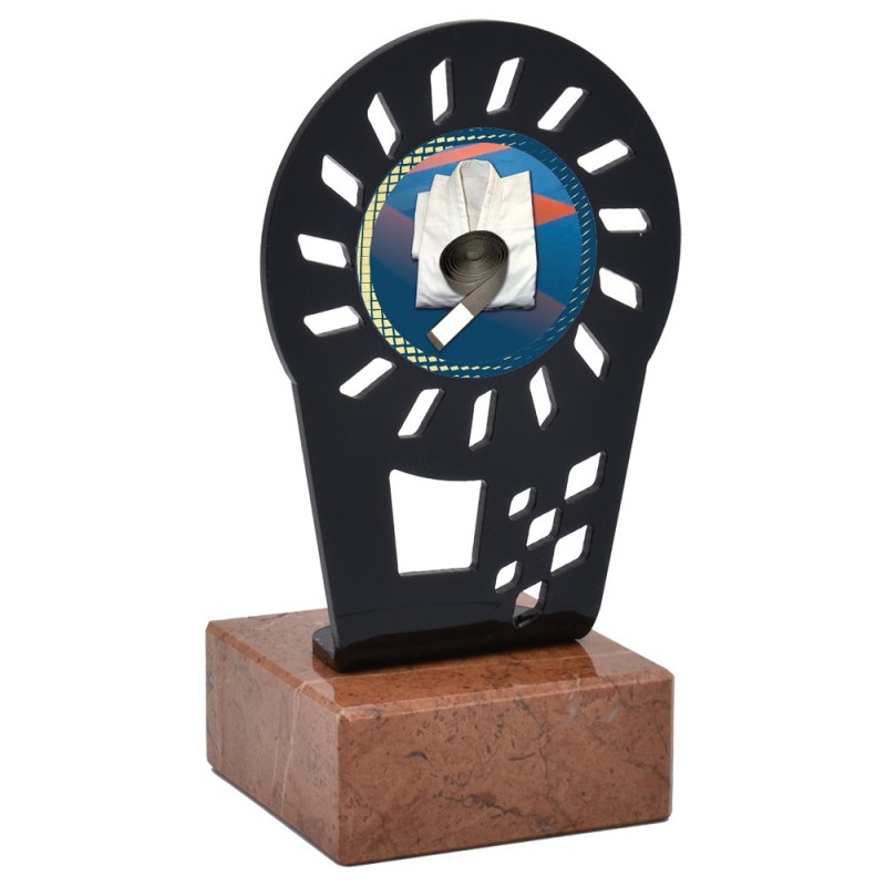 Trofeo deportivo de metacrilato de la serie 0011 con disco central de artes marciales incluido. Fabricado en metacrilato con una línea moderna y actual, de gran calidad y con base de mármol. Trofeo ideal para entregar a participantes, campeones y finalistas de competiciones y torneos de artes marciales.