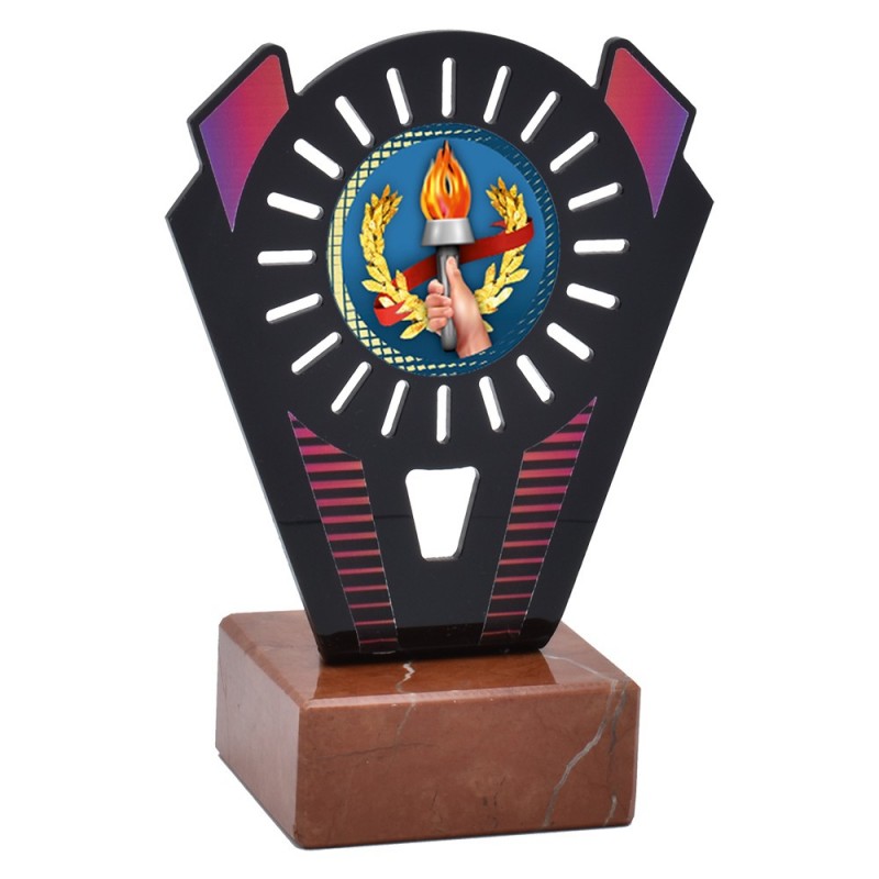 Trofeo deportivo de metacrilato de la serie 0021 con disco central de antorcha con corona de laurel incluido. Fabricado en metacrilato con una línea moderna y actual, de gran calidad y con base de mármol. Trofeo ideal para entregar a participantes, campeones y finalistas de competiciones y torneos deportivos.