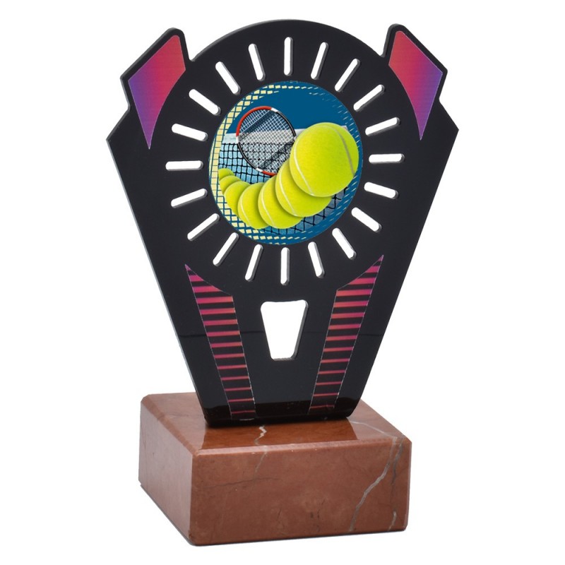 Trofeo deportivo de metacrilato de la serie 0021 con disco central de tenis incluido. Fabricado en metacrilato con una línea moderna y actual, de gran calidad y con base de mármol. Trofeo ideal para entregar a participantes, campeones y finalistas de competiciones y torneos de tenis.