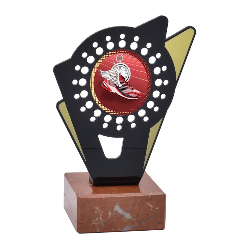 Trofeo deportivo de metacrilato de la serie 0031 con disco central de atletismo incluido. Fabricado en metacrilato con una línea moderna y actual, de gran calidad y con base de mármol. Trofeo ideal para entregar a participantes, campeones y finalistas de competiciones y torneos de atletismo.