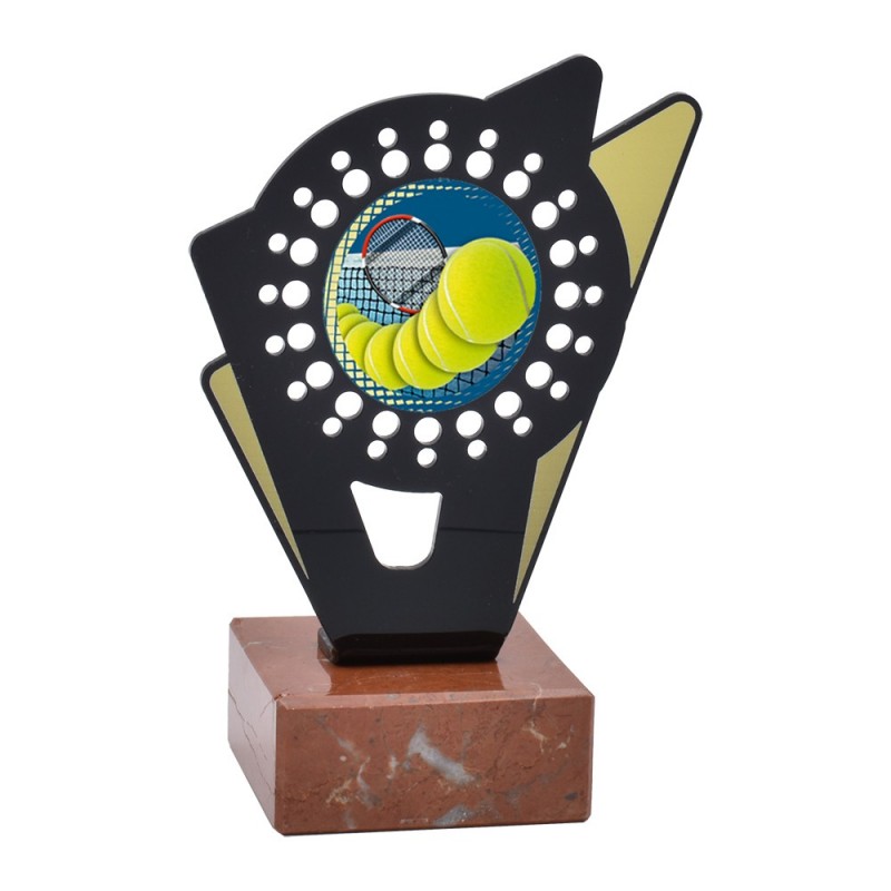 Trofeo deportivo de metacrilato de la serie 0031 con disco central de tenis incluido. Fabricado en metacrilato con una línea moderna y actual, de gran calidad y con base de mármol. Trofeo ideal para entregar a participantes, campeones y finalistas de competiciones y torneos de tenis.