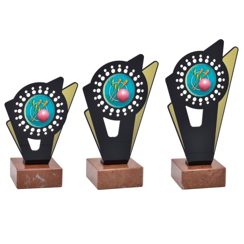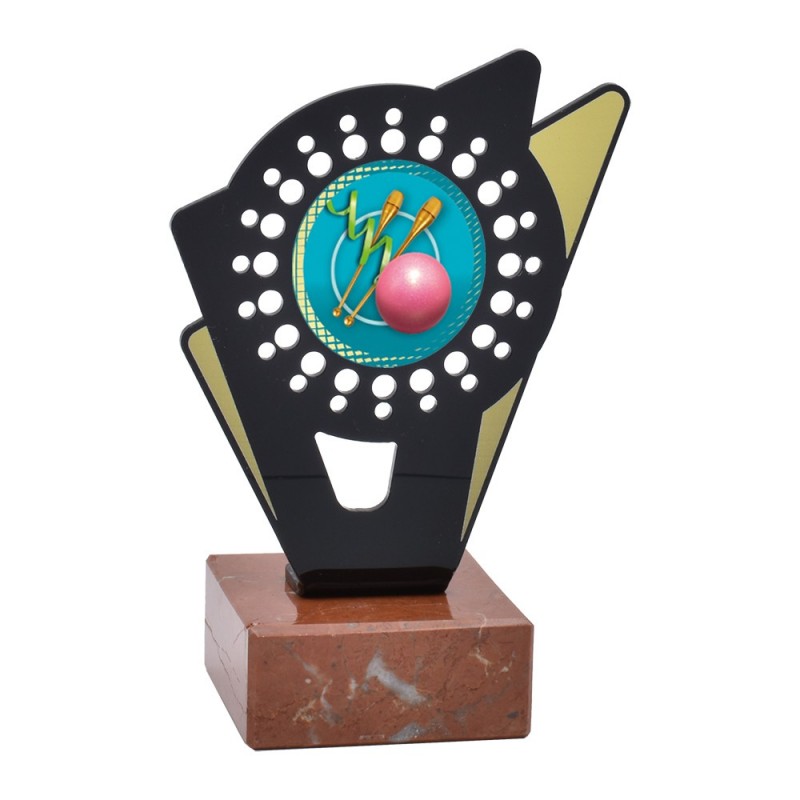 Trofeo deportivo de metacrilato de la serie 0031 con disco central de gimnasia rítmica incluido. Fabricado en metacrilato con una línea moderna y actual, de gran calidad y con base de mármol. Trofeo ideal para entregar a participantes, campeones y finalistas de competiciones y torneos de gimnasia rítmica.