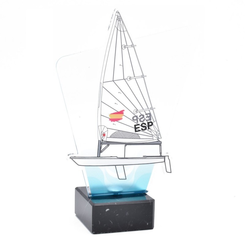 Trofeo de vela laser realizado en metacrilato que representa la figura de una embarcación de vela ligera laser. Cuenta con un diseño a color que le da un toque actual y una peana de marmol. Perfecto para entregar a participantes y ganadores de competiciones de esta disciplina de vela.