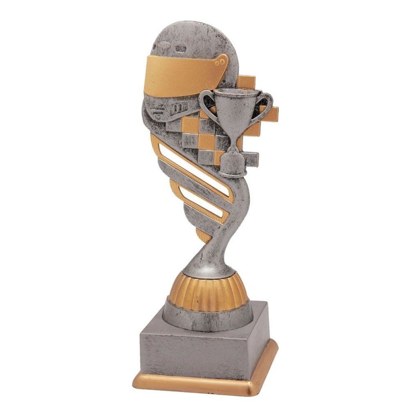 En este trofeo es de destacar la alegoría de deportes de motor representada por un casco y una bandera finish, situada sobre la peana al tono, y que está diseñada con resaltes tanto por el anverso como por el reverso. Opcional la grabación de texto a láser en placa colocada en la peana.