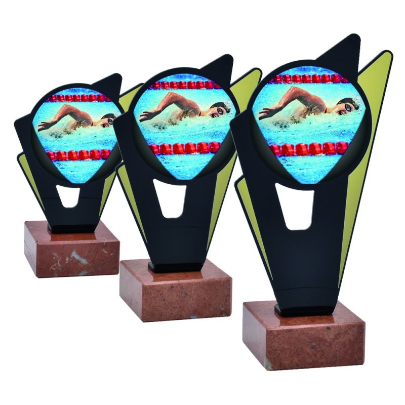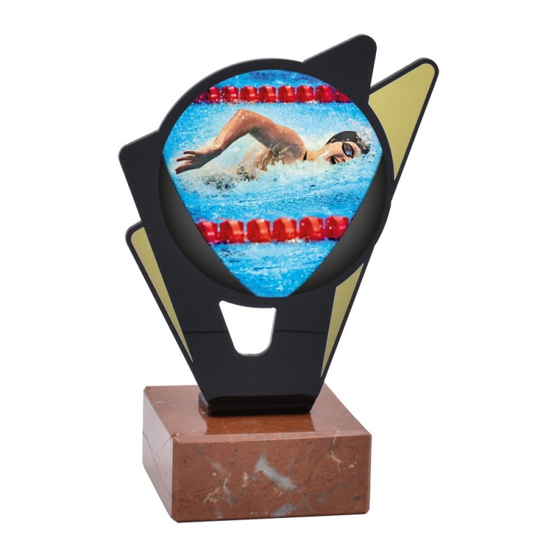 Trofeo deportivo de metacrilato de la serie 0021 con disco central de natación. Fabricado en metacrilato con una línea moderna y actual, de gran calidad y con base de mármol. Trofeo ideal para entregar a participantes, campeones y finalistas de competiciones y torneos de natación femenina.