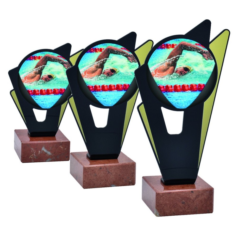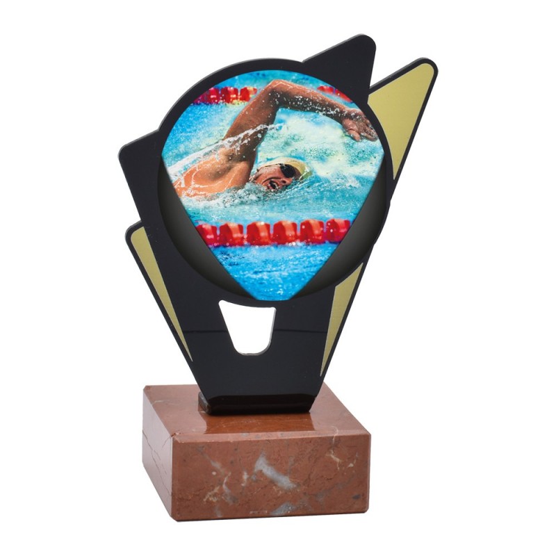 Trofeo deportivo de metacrilato de la serie 0021 con disco central de natación. Fabricado en metacrilato con una línea moderna y actual, de gran calidad y con base de mármol. Trofeo ideal para entregar a participantes, campeones y finalistas de competiciones y torneos de natación.