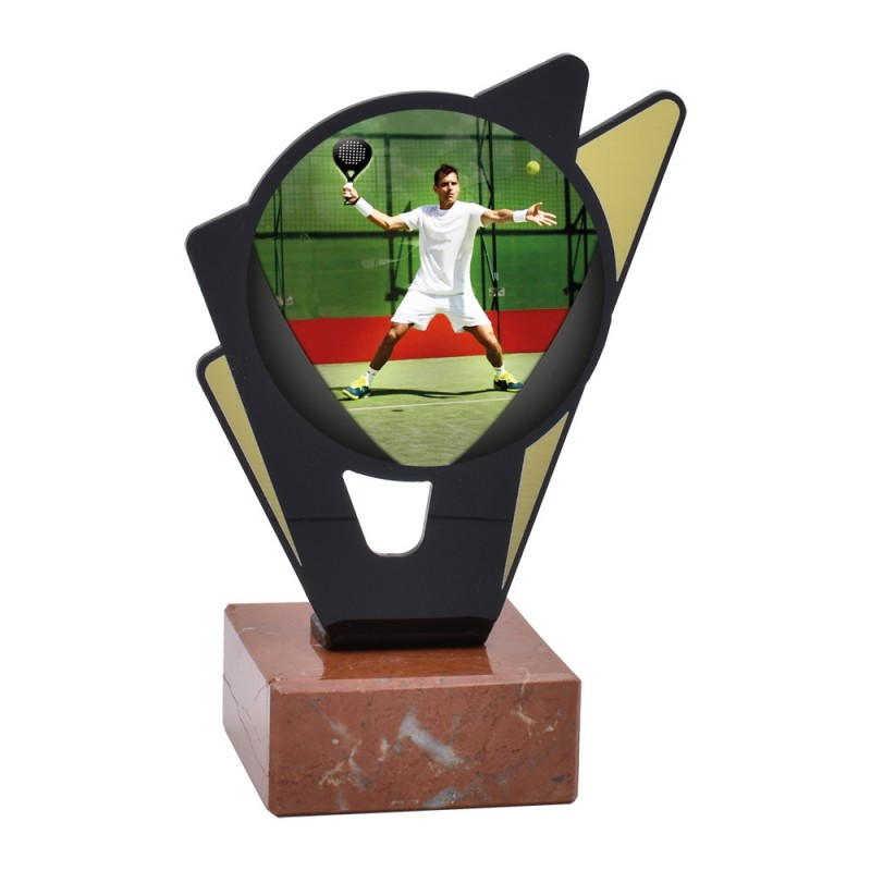 Trofeo deportivo de metacrilato de la serie 0021 con disco central de pádel. Fabricado en metacrilato con una línea moderna y actual, de gran calidad y con base de mármol. Trofeo ideal para entregar a participantes, campeones y finalistas de competiciones y torneos de pádel.