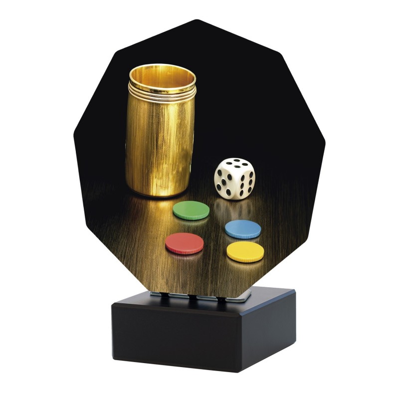 Trofeo moderno para campeonatos de parchís. Colección Luxor con base de mármol. Disponible en tres tamaños y personalizable con texto.
