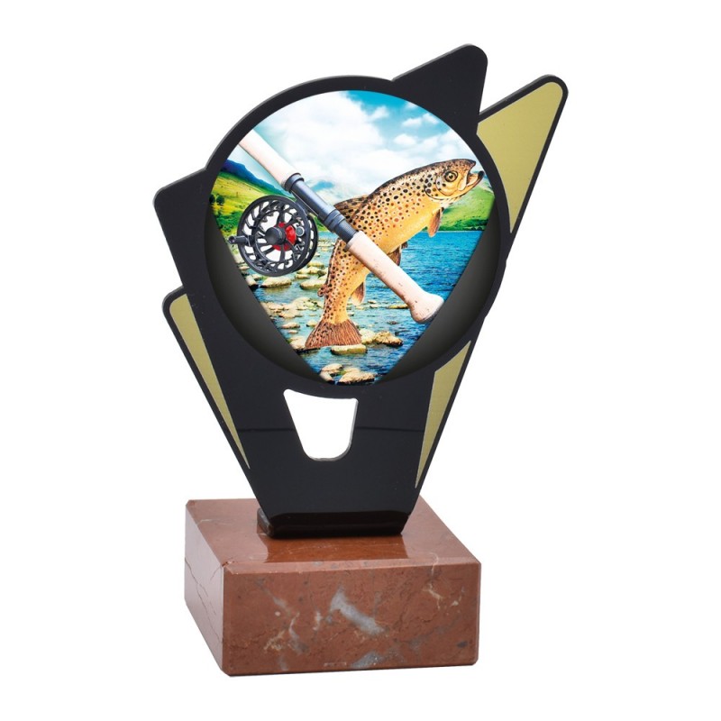 Trofeo deportivo de metacrilato de la serie 0031 con disco central de pesca en río. Fabricado en metacrilato con una línea moderna y actual, de gran calidad y con base de mármol. Trofeo ideal para entregar a participantes, campeones y finalistas de competiciones y torneos de pesca deportiva.